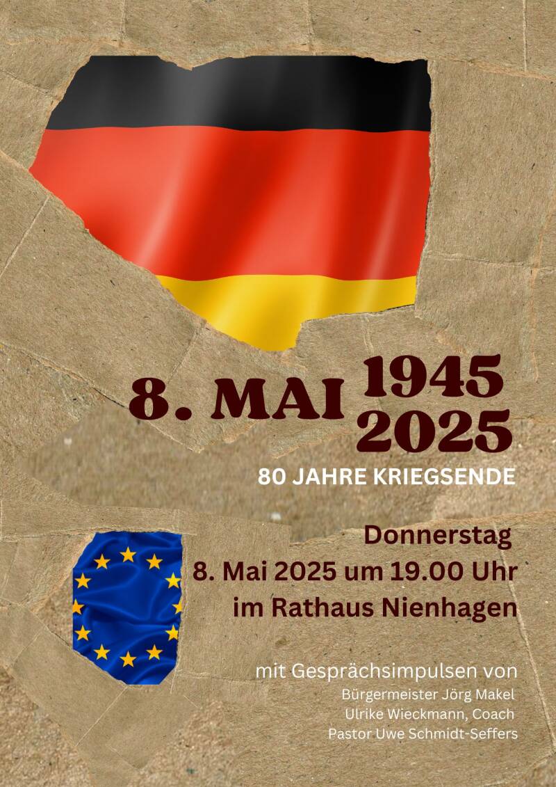 Am 8. Mai 2025 um 19 Uhr findet im Rathaus Nienhagen eine Gedenkstunde zum Thema 80 Jahre Kriegsende mit Gesprächsimpulsen von Bürgermeister Jörg Makel, Pastor Uwe Schmidt-Seffers und mir statt.